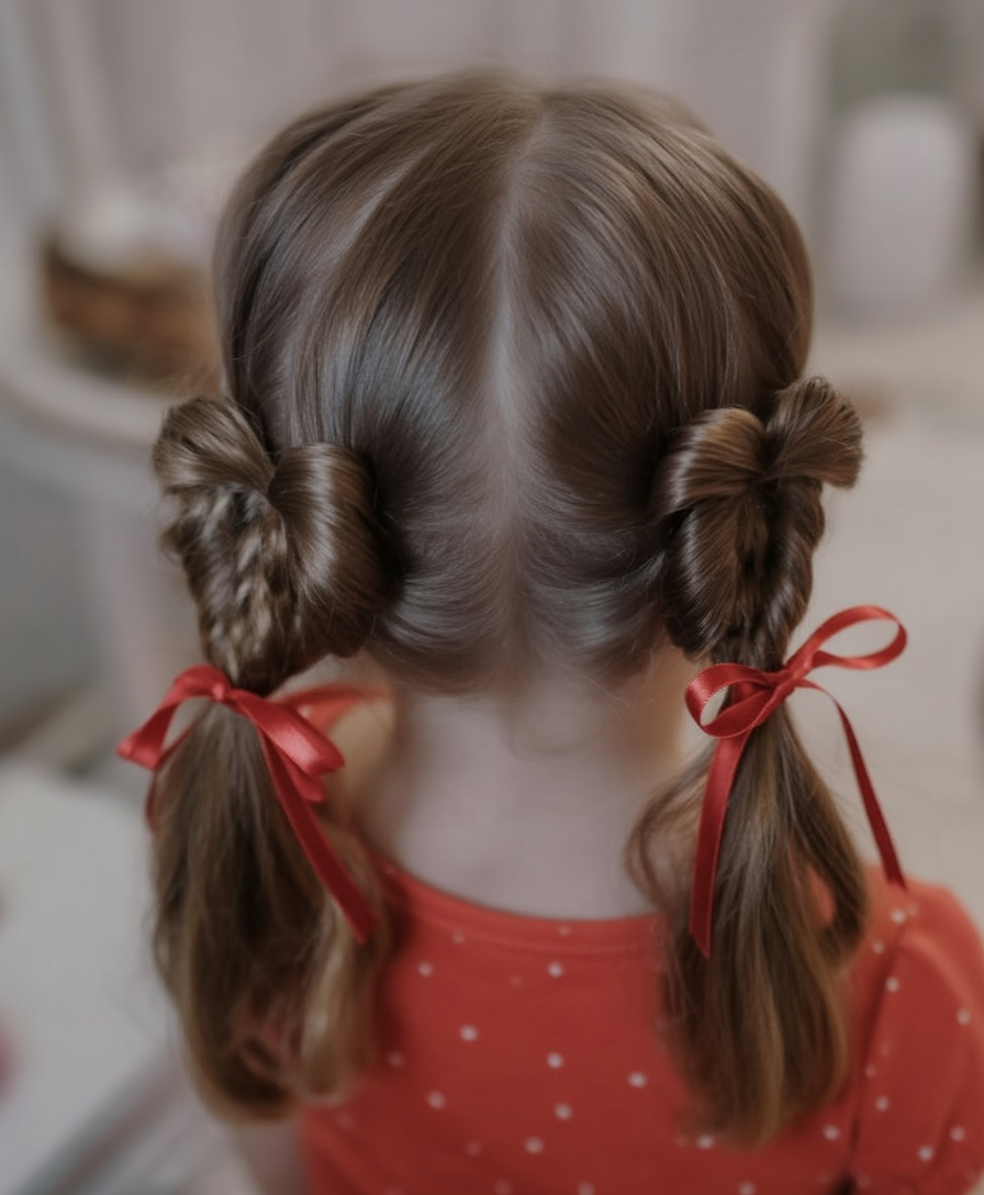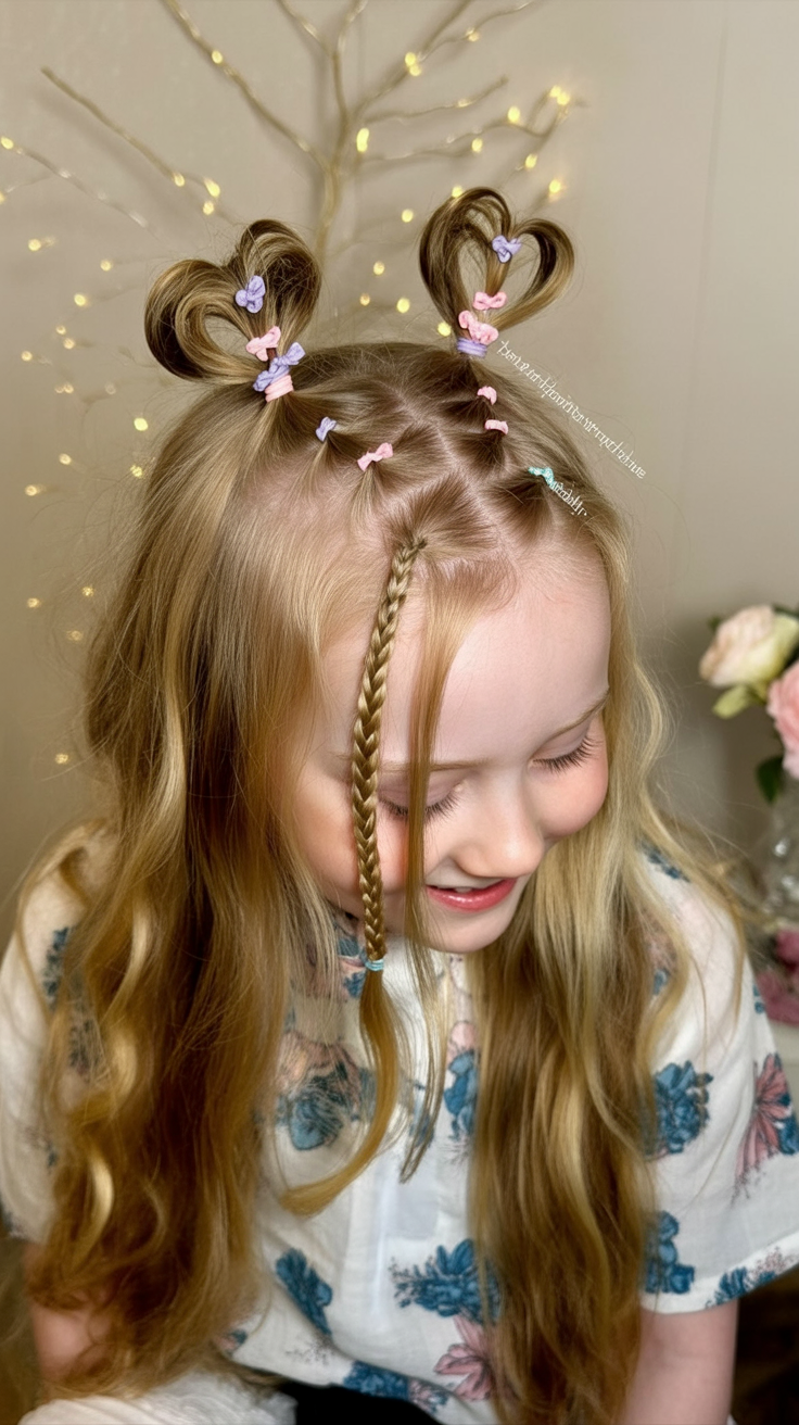 If your child is all about whimsy, this double heart style is basically a wearable Valentine card. Two high sections are looped into sweetheart shapes on top, tied off with pastel elastics, and accented with a tiny braid that frames the face. It has that cute, animated feel that kids love, and it instantly makes any simple dress or T-shirt look special without needing extra accessories.