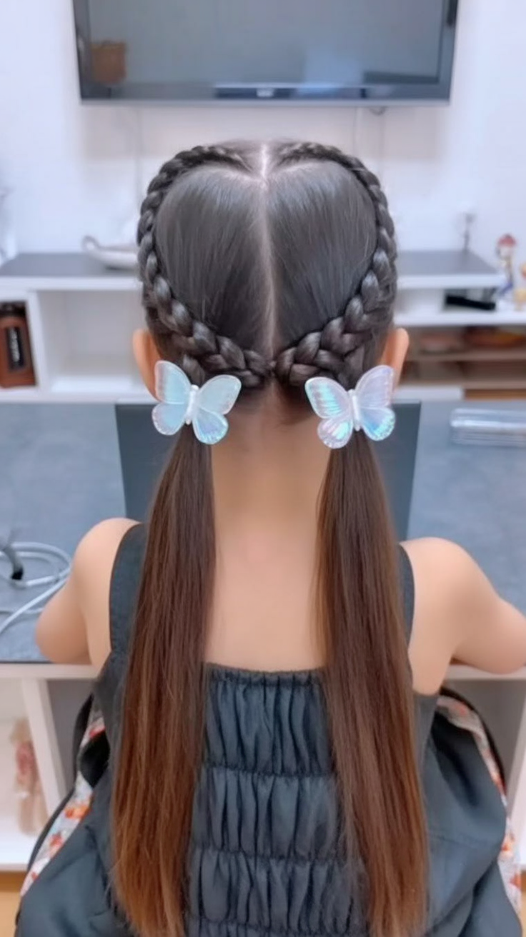 This is a gorgeous pick for long hair with medium to thick texture, because the braids need a bit of fullness to really show off the heart shape. If your child has straight or natural hair, add a touch of light mousse before braiding to help the sections grip. Start with a clean center part, map out a heart-part hairstyle guide with the comb, and then work in easy braids along the edges. Once you’ve secured the pony, wrap a small strand of hair around the base for a simple, polished finish that looks like it came straight out of a hair tutorial video but is totally doable at home.