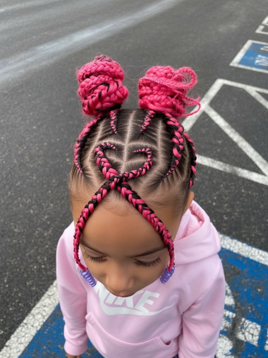 This one is definitely designed for the little heartbreaker.” Sleek cornrows are threaded with neon pink extensions and gathered into ultra-chunky space buns, while a statement heart shapes the hairline. With a heart shape and the play with pink and black hair, it’s almost like wearing a mini piece of art to school for your Valentine’s event or for the weekend.