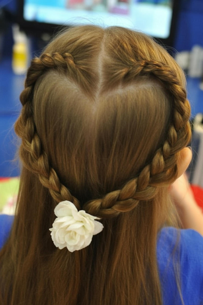 Unlike a few intricate heart braid designs, this one’s still rather simple, and that’s a positive if you’re just diving into learning about heart part hairstyles for kids. It’s great on long hair or medium lengths with a little weight so the braids lay flat. With a fine-toothed comb and some smoothing serum, your sections will keep tight, and once you’ve pinned everything in place, it’s snug enough to last all day without tugging or slipping.