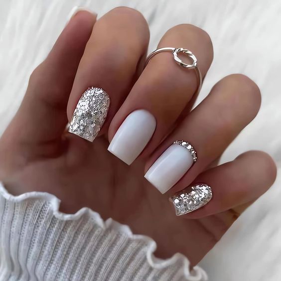 This stunning manicure combines white with silver glitter, creating a frosted winter wonderland look. The short square acrylic nails give a timeless yet modern feel, making it perfect for both casual days and elegant nights. The accents of bling along the cuticles add a touch of glamour without being overwhelming.