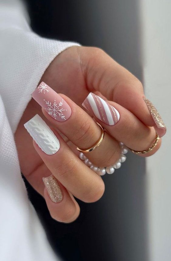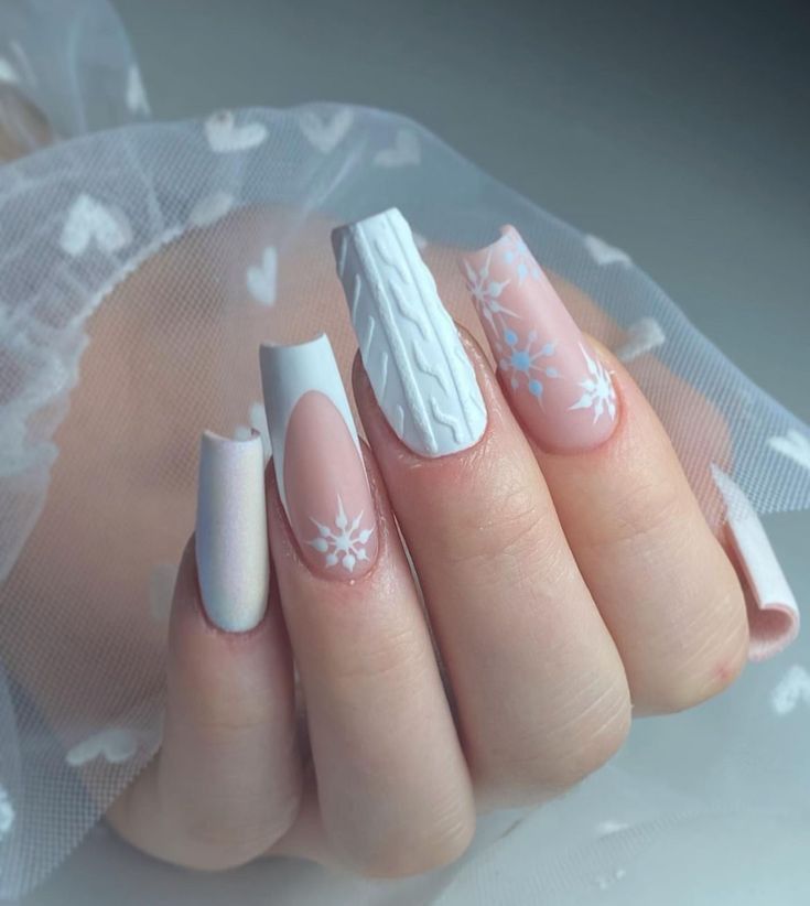 A combination of matte and glitter effects on coffin-shaped nails makes this design a winter favorite. The cable-knit pattern on one nail adds a cozy, sweater-inspired texture, while the snowflakes bring in that frosty winter aesthetic. The soft pink and white tones create a delicate, wintry palette that works perfectly with cold weather outfits.
