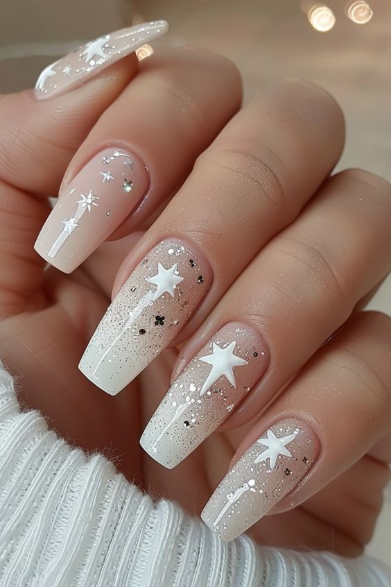 This design features a starry night theme with a touch of glitter and bling. White stars are delicately painted on a gradient background, transitioning from nude to shimmery white. The square-shaped nails offer a clean and modern look, ideal for winter celebrations and New Year’s Eve parties.