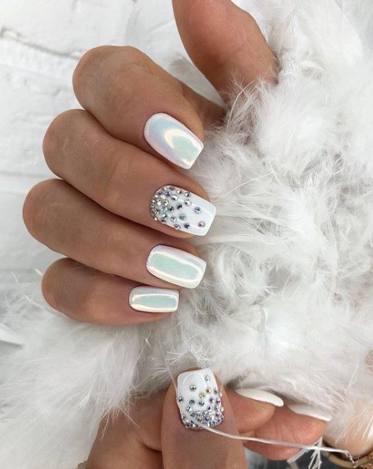 These short square nails exude elegance with their pearlescent finish and rhinestone accents. The reflective, iridescent surface on most of the nails is paired with one rhinestone-embellished nail, giving the design an icy, regal look.