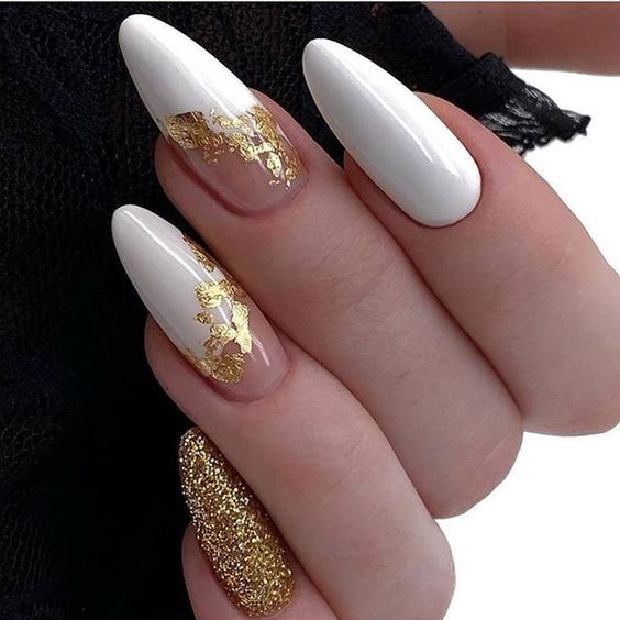 White and Gold Glam Almond Nails