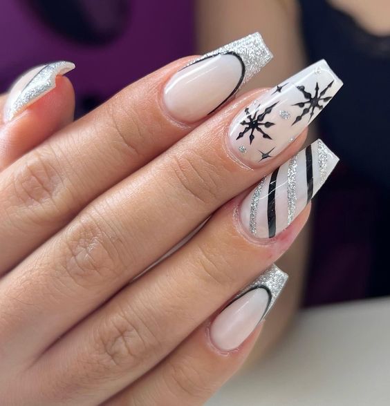 For those who enjoy bold contrast, this black-and-white snowflake design is a standout. The coffin-shaped nails combine silver glitter, white snowflakes, and black accents in a geometric pattern, creating a modern winter look. The combination of stripes and snowflakes offers a trendy twist on traditional winter nails.
