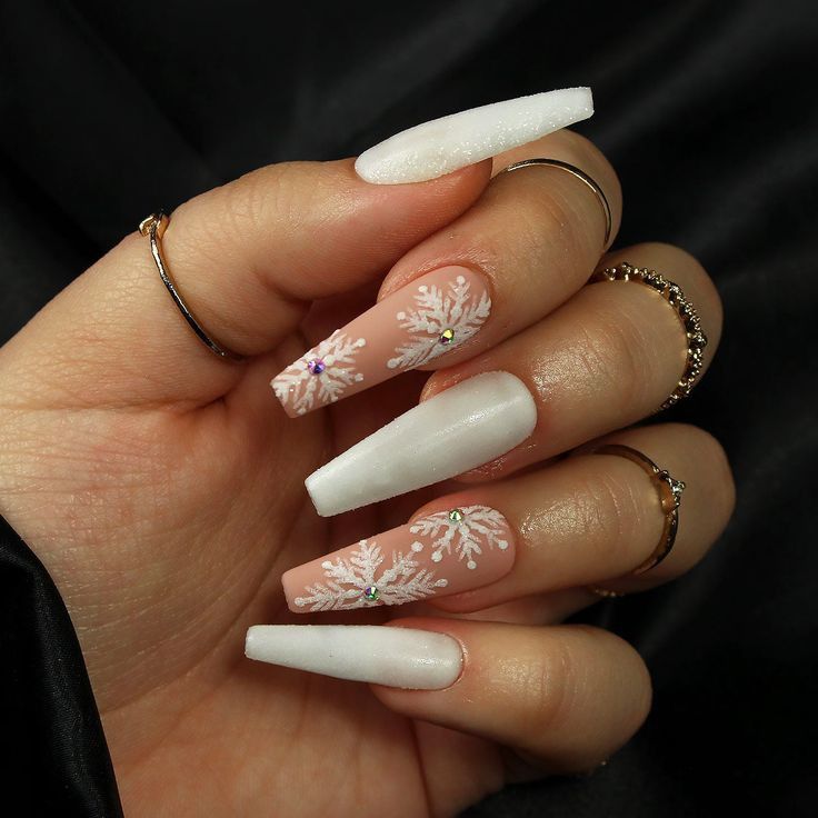 For those who love a dramatic look, these long coffin nails feature intricate snowflake designs with delicate bling accents. The mix of soft nude and white colors paired with shimmering rhinestones adds a glamorous touch, perfect for winter events and parties. The coffin shape enhances the elegance of this design, making it a true statement piece.