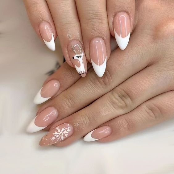 These almond-shaped nails are a go-to for those who want a bit of art on their nails but also love the aesthetic of classic manicures. The reindeer and snowflake accents, coupled with glitter, make this a perfect design for both family gatherings and holiday parties.