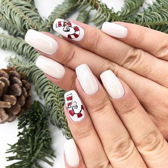 This design offers a beautiful mix of tradition and trend, making it a top pick for Christmas 2024 nail styles. The playful element of red and white candy canes on a square nail shape is bound to bring out the holiday cheer.