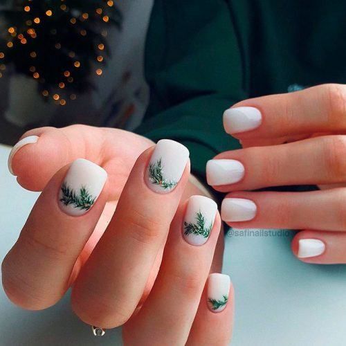 For a fresh take on white winter nails, this design incorporates small evergreen tips on a pure white background. The minimalist approach to holiday nail art makes it a standout without being too bold. The round shape gives this design a soft, feminine touch, perfect for winter parties and everyday wear.