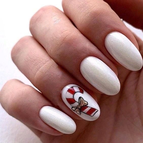 This elegant oval-shaped nail design brings a charming holiday twist with its bold red and white candy cane accent on one finger. The glossy white finish on the other nails gives a clean, polished look perfect for the winter season. The glittery golden bow adds a festive touch, making these nails ideal for holiday parties or cozy winter evenings.