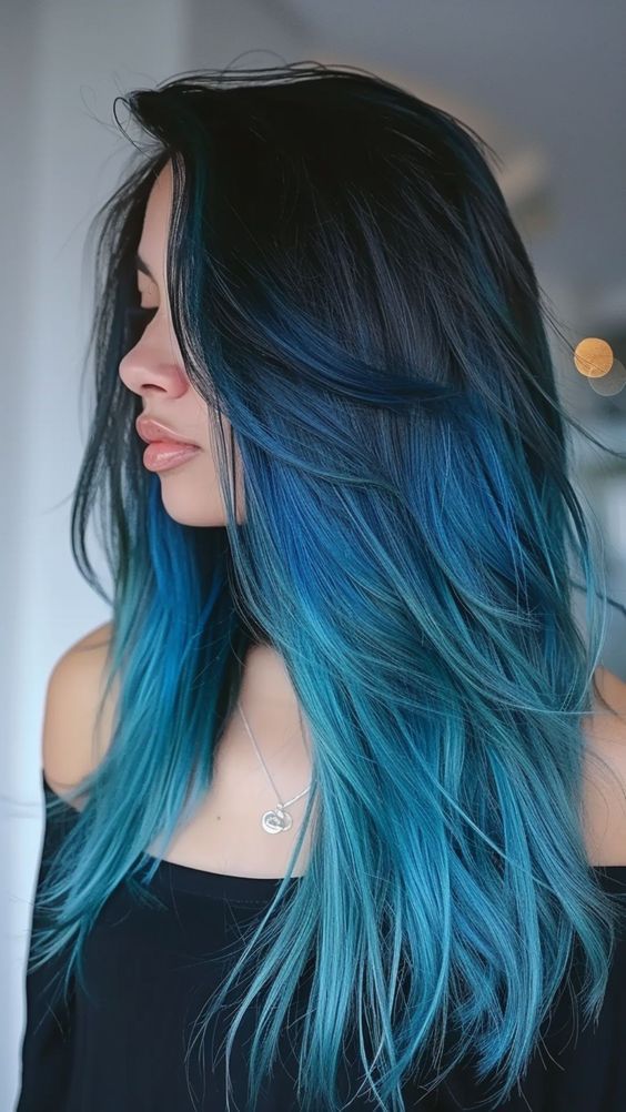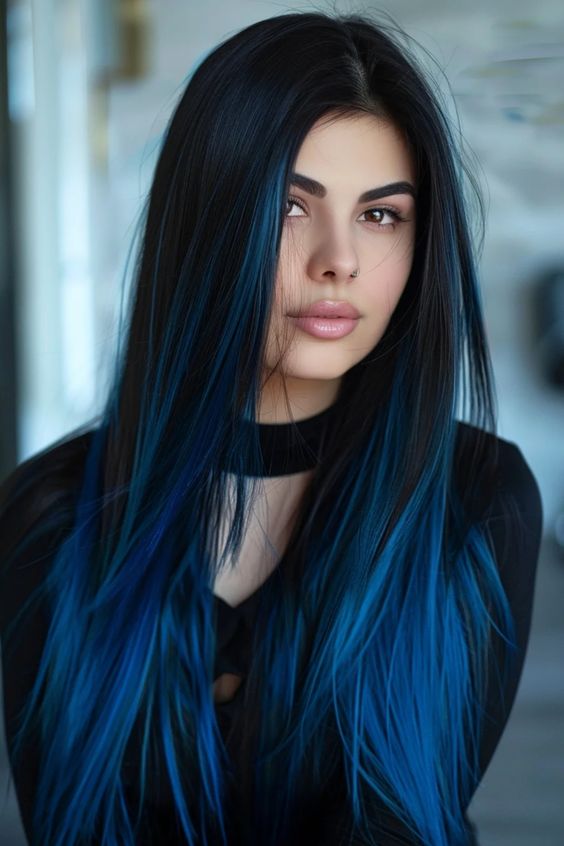 For a bold, edgy look, the midnight blue ombre is a stunning trend for 2025. This deep blue gradually fades into black, creating a striking contrast that’s perfect for winter color trends. Midnight blue ombre suits women with cool undertones and dark hair, adding a mysterious and dramatic flair to long hair. This color is perfect for evening events or when you want to make a bold statement.