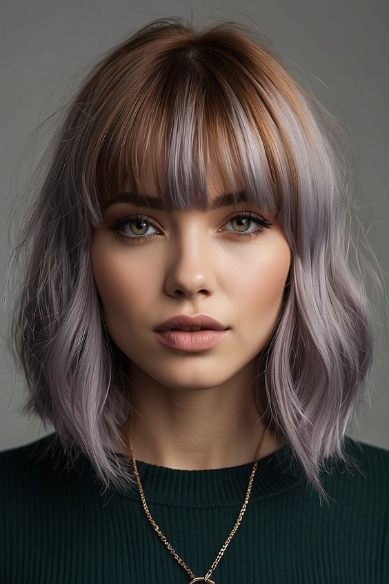 For those who love to experiment with color, the frosted lilac bob is a bold choice for 2024. This pastel trend combines cool lilac with icy undertones, perfect for blondes looking to add a pop of color to their winter look. The frosted lilac hue is ideal for women with fair skin and light-colored eyes, adding a whimsical touch to their style. This color works beautifully on shoulder length hair, making it a trendy option for the season.