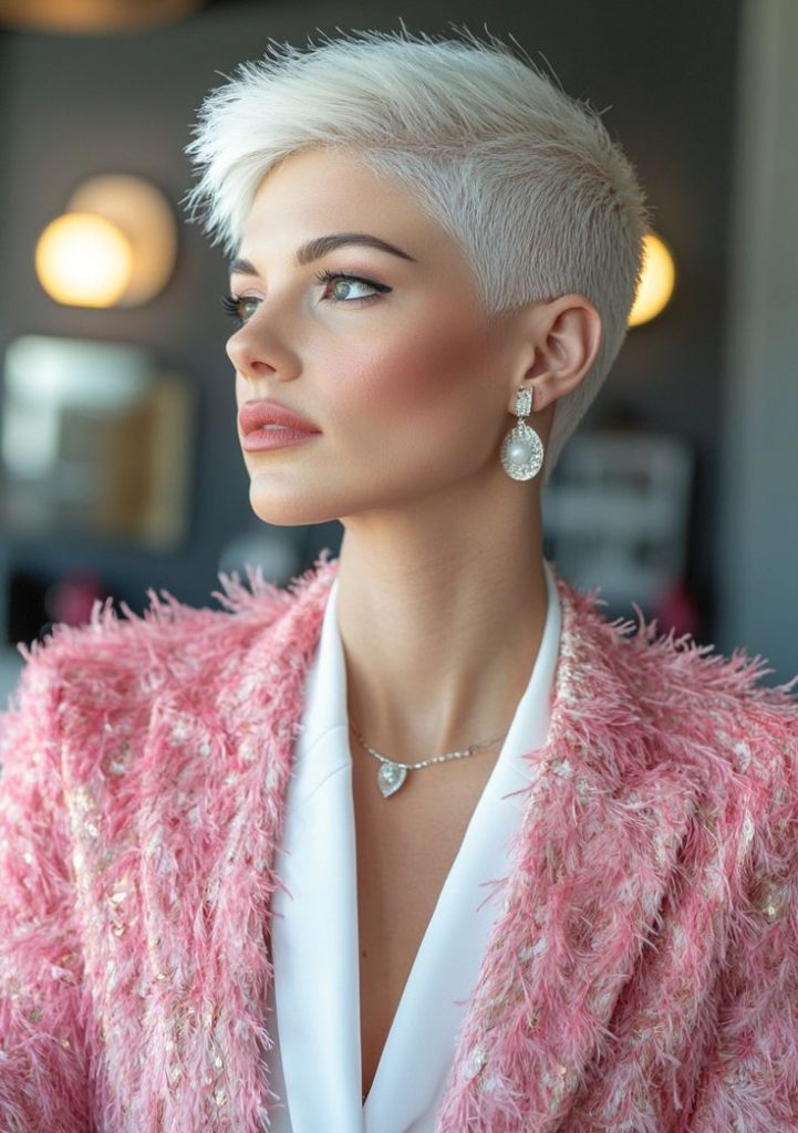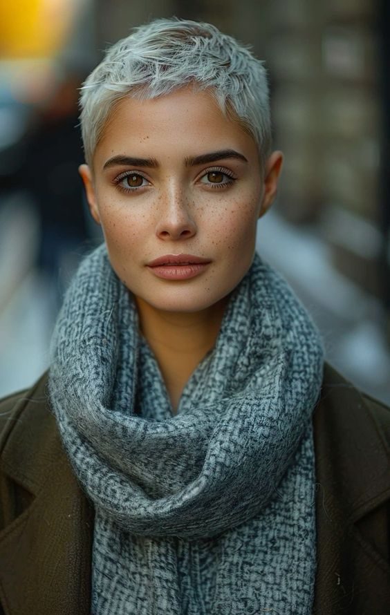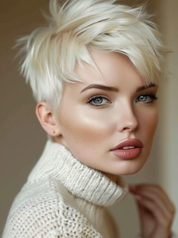 For those who prefer a more polished and edgy look, the sleek platinum pixie is a standout choice for short hair this winter. The icy platinum color paired with the sharp, clean lines of the pixie cut gives a futuristic and high-fashion vibe. This look is perfect for both formal occasions and everyday wear, adding a touch of sophistication and modernity to your winter wardrobe.