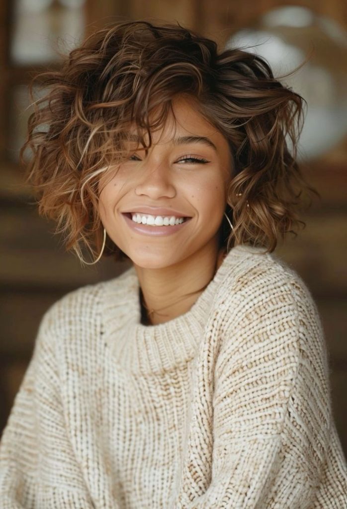 The textured bob is a playful and youthful hairstyle perfect for short hair. This look features soft, loose waves that add volume and movement, making it ideal for winter. The natural texture of the waves gives a carefree, cozy vibe that’s perfect for any casual outing or winter day spent indoors. The length hits just above the shoulders, making it versatile and easy to manage, especially in winter when you need to layer up.