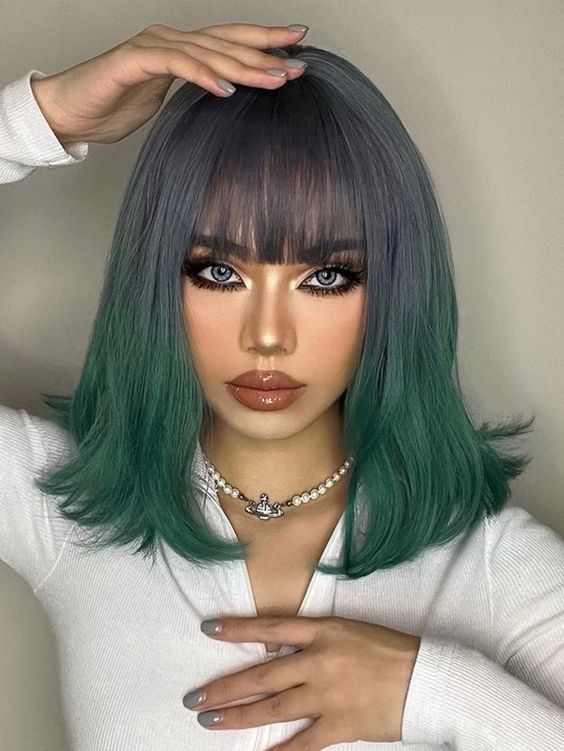 For those with medium shoulder length hair, this emerald ombre bob is a fantastic option. The deep green tones blended seamlessly into a dark base create a look that’s both edgy and elegant. The soft waves add a touch of femininity, making this style versatile enough for both work and party settings. The blunt bangs frame the face beautifully, adding structure to the overall look, and are a nod to the rising popularity of K-pop-inspired hairstyles, especially those seen on groups like Aespa.