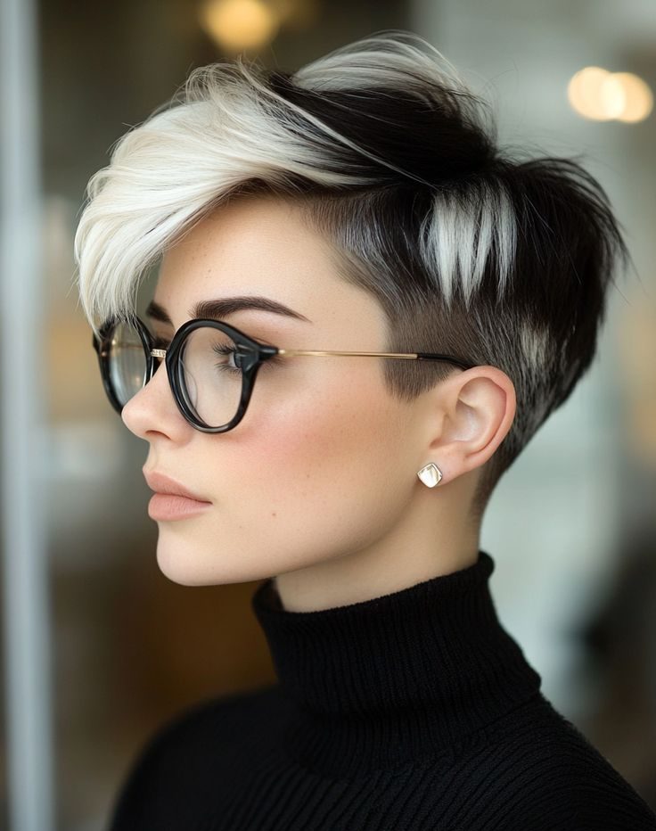 A monochrome pixie cut with a bold, contrasting twist is perfect for short hair lovers looking to stand out this winter. The stark contrast between the black and platinum sections adds an avant-garde edge, making it a top choice for the fashion-forward. The sleek, swept-over style exudes confidence and sophistication, perfect for a formal occasion or a night out.