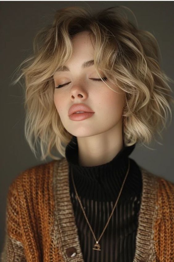 For those with medium length hair, a tousled bob with soft curls is the perfect winter hairstyle. The loose, undone curls add a playful touch, making this style ideal for both casual and formal occasions. The soft blonde highlights give dimension and a youthful glow, perfect for brightening up the darker winter months.