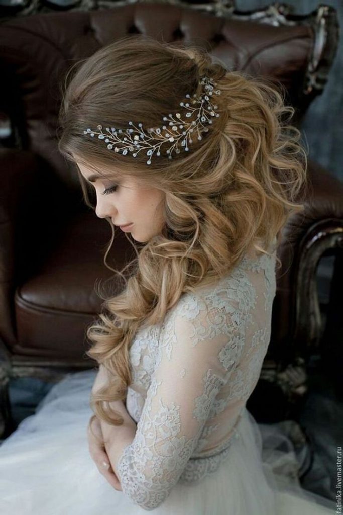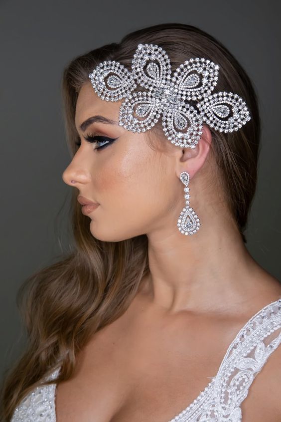 For those seeking a touch of old Hollywood glamour, this hairstyle is an excellent choice. Long hair is styled into deep, luxurious waves that cascade over the shoulders. A dazzling, bejeweled headpiece sits just above the forehead, adding a glamorous, vintage-inspired touch. This hairstyle is perfect for brides who want to feel like a star on their wedding day, with a look that combines timeless elegance with a hint of sparkle that’s ideal for a winter celebration.