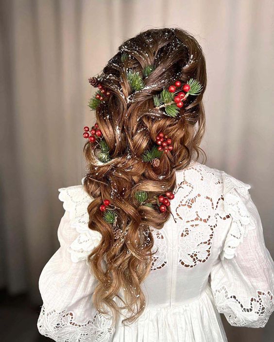 This breathtaking hairstyle is the epitome of winter magic. Long hair is styled into a cascading braid, with tendrils intricately woven throughout to create a voluminous, romantic look. The braid is adorned with festive elements such as small pine branches and bright red berries, adding a touch of holiday spirit to the overall style. This hairstyle is ideal for brides who want to fully embrace the winter season, making a statement with their hair that ties in beautifully with the wintery theme of their wedding.