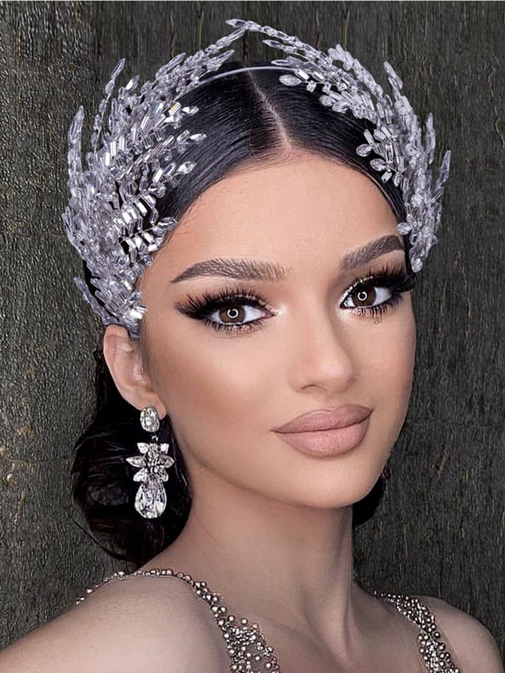 For a bride looking to exude elegance and sophistication, this sleek hairstyle is perfect. The hair is parted cleanly down the middle and styled back into a smooth, low bun, allowing the striking crystal headpiece to take center stage. The headpiece itself is a work of art, resembling an icy crown that adds a regal touch to the overall look. This style is ideal for brides with medium length or short hair, as it provides a polished finish that pairs beautifully with luxurious winter wedding gowns.
