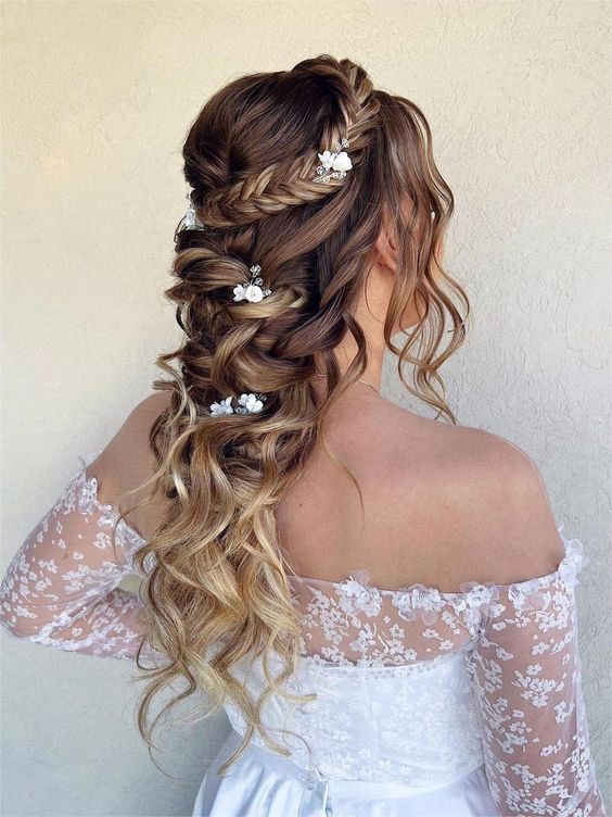 This romantic half-updo is a dreamy choice for a winter wedding. The long hair is braided into delicate fishtails that are then twisted and pinned into a half-up style, allowing the remaining hair to cascade in soft waves down the back. Small, white floral accents are interspersed throughout the braid, adding a subtle yet charming detail. This hairstyle is perfect for brides who want a look that is both elegant and relaxed, with a touch of whimsy that complements a winter wonderland setting.