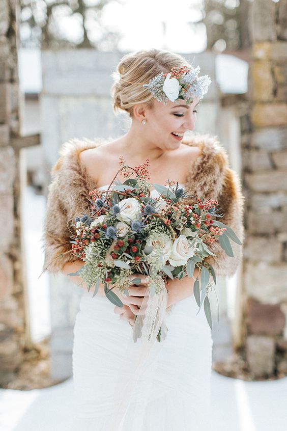 For a bride who wants to embrace the natural beauty of the season, this rustic braided hairstyle is a perfect choice. The long hair is styled in a loose braid that cascades over one shoulder, while a crown of winter greenery and red berries weaves through the braid, adding a festive touch. This hairstyle is ideal for brides planning an outdoor winter ceremony or a woodland-themed wedding. The incorporation of natural elements into the hair not only ties in with the season but also brings a whimsical, ethereal vibe to the overall look.