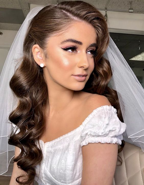 Embrace the allure of vintage glamour with this stunning hairstyle. The long hair is styled in voluminous curls, with a deep side part that adds to the drama. A sparkling tiara sits atop the hair, completing the look with a touch of royalty. This hairstyle is perfect for brides who want to feel like a queen on their special day. It’s a versatile look that works well with a variety of gown styles, from ballgowns to more streamlined silhouettes.