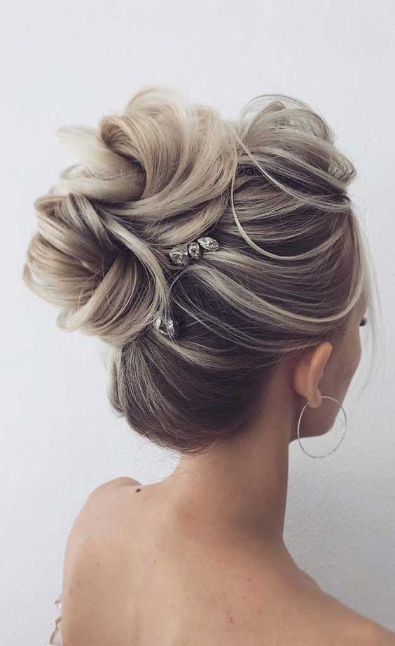 This hairstyle is a perfect choice for a winter wedding set in a snowy landscape. The long hair is styled in voluminous curls that add a touch of whimsy and romance. A sparkly hair accessory is added to one side, catching the light and giving a nod to the festive season. This look is perfect for a bride who wants to embrace the winter theme fully, with curls that mimic the softness of freshly fallen snow. It pairs beautifully with a winter bridal gown that features lace or intricate detailing.