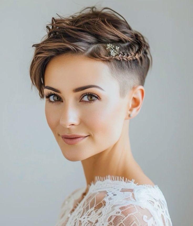 For those with short hair, this pixie cut with a braided accent offers a fresh and stylish option. The hair is styled in a way that enhances its natural texture, while a small braid adds a playful and feminine touch. This look is ideal for a bride who wants to showcase her unique style while still keeping things elegant and wedding-appropriate. It’s also a great option for bridesmaids who want a low-maintenance yet chic hairstyle that complements the bride’s look.