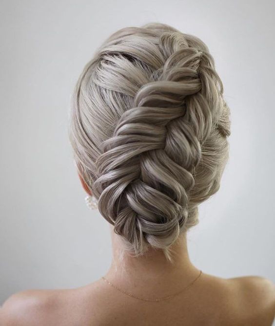 This elegant updo is a sophisticated choice for a winter wedding. The hair is expertly woven into a French braid that follows the curve of the head, leading into a beautifully tucked chignon at the nape of the neck. The smooth, polished texture of the braid ensures that the hairstyle stays neat and secure throughout the day, making it an ideal option for brides with medium length hair who want a look that’s both classic and practical. This style pairs beautifully with delicate pearl or crystal hair accessories that add a touch of sparkle without overwhelming the look.
